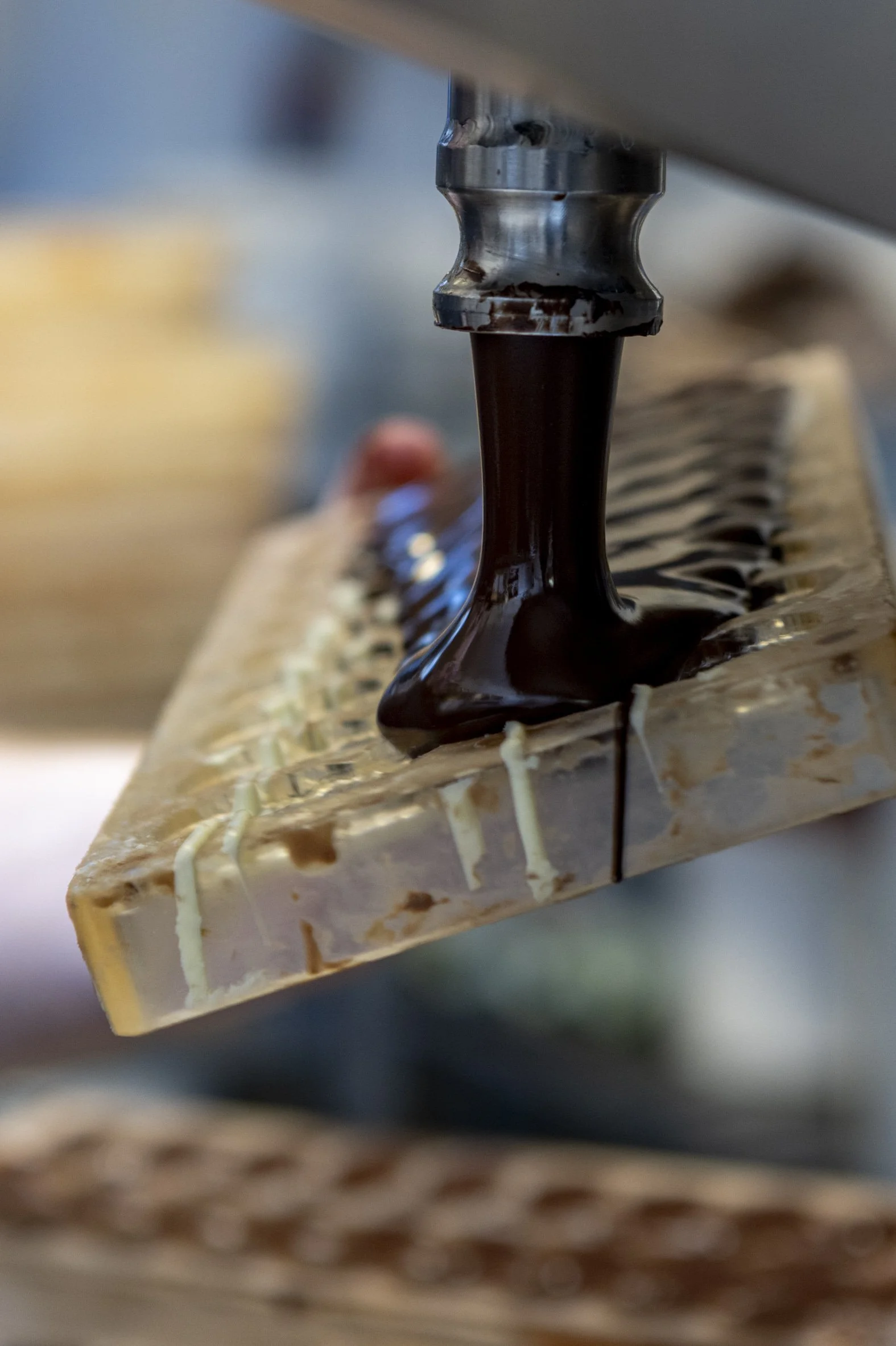 In ons atelier in Antwerpen wordt die chocolade vervolgens met de hand gegoten en afgewerkt. Dat ambachtelijke proces vraagt tijd en vakmanschap, maar zorgt voor een smaak en kwaliteit die je meteen proeft.